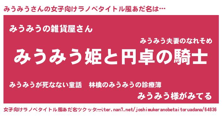 | 男性向けラノベタイトル風あだ名 | 『みうみうの憂鬱』『魔弾の王とみうみう』 |