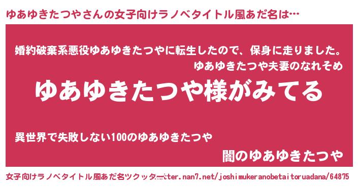 | 男性向けラノベタイトル風あだ名 | 『ゆあゆきたつやの嫁は女の子じゃないと思った?』 |