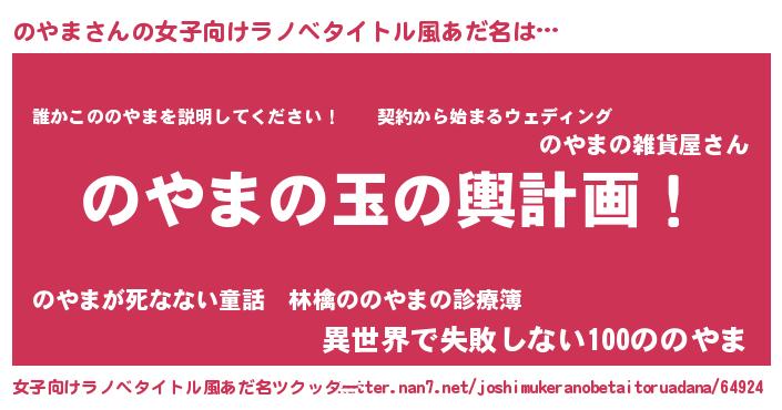 | 男性向けラノベタイトル風あだ名 | 『のやま~年齢イコール彼女いない歴の魔法使い~』 |