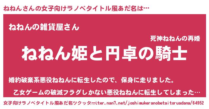 | 男性向けラノベタイトル風あだ名 | 『ねねんの憂鬱』『魔弾の王とねねん』 |