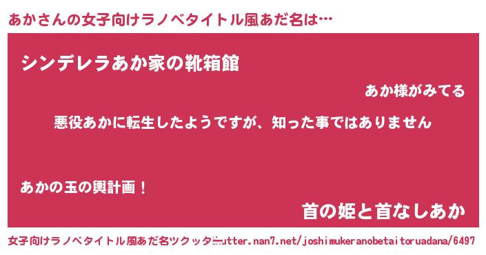 あかさんの女子向けラノベタイトル風あだ名は… 『悪役あかに転生したようですが、知った事ではありません』『シンデレラあか家の靴箱館』『首の姫と首なしあか』 ツクッター #女子向けラノベタイトル風あだ名ツクッター http://tkutter.nan7.net/joshimukeranobetaitoruadana/6497/