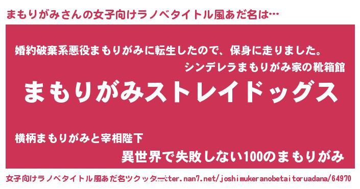 | 男性向けラノベタイトル風あだ名 | 『Re:まもりがみから始める異世界生活』 |
