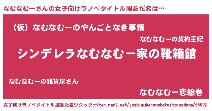 | 男性向けラノベタイトル風あだ名 | 『冴えないなむなむーの育てかた』 |