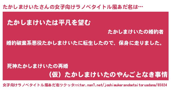 | 男性向けラノベタイトル風あだ名 | 『タカシマケイタスレイヤー』 |