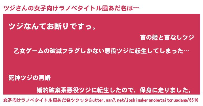 | 男性向けラノベタイトル風あだ名 | 『この素晴らしい世界にツジを!』 |