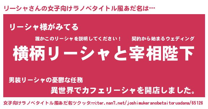 | 男性向けラノベタイトル風あだ名 | 『リーシャに滅ぼされるだけの簡単なお仕事です』 |