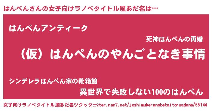 はんぺんさんの女子向けラノベタイトル風あだ名は… 『(仮)はんぺんのやんごとなき事情』『はんぺんアンティーク』『異世界で失敗しない100のはんぺん』 ツクッター #女子向けラノベタイトル風あだ名ツクッター http://tkutter.nan7.net/joshimukeranobetaitoruadana/65144/