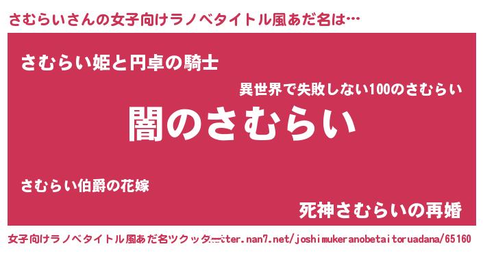 | 男性向けラノベタイトル風あだ名 | 『Re:さむらいから始める異世界生活』 |