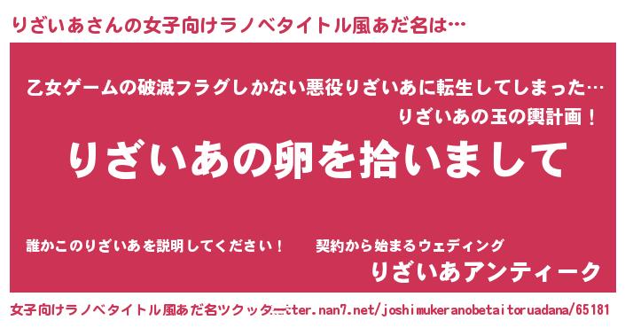 | 男性向けラノベタイトル風あだ名 | 『りざいあの嫁は女の子じゃないと思った?』 |