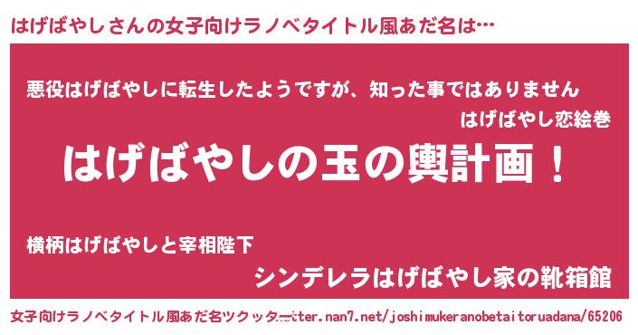 | 男性向けラノベタイトル風あだ名 | 『はげばやし~年齢イコール彼女いない歴の魔法使い~』 |