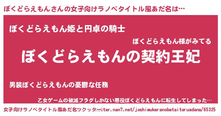ぼくどらえもんさんの女子向けラノベタイトル風あだ名は… 『ぼくどらえもんの契約王妃』『ぼくどらえもん姫と円卓の騎士』『乙女ゲームの破滅フラグしかない悪役ぼくどらえもんに転生してしまった…』 ツクッター #女子向けラノベタイトル風あだ名ツクッター http://tkutter.nan7.net/joshimukeranobetaitoruadana/65325/