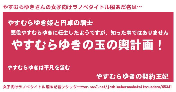 | 男性向けラノベタイトル風あだ名 | 『やすむらゆき~年齢イコール彼女いない歴の魔法使い~』 |