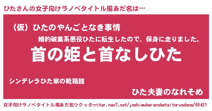 ひたさんの女子向けラノベタイトル風あだ名は… 『首の姫と首なしひた』『(仮)ひたのやんごとなき事情』『ひた夫妻のなれそめ』 ツクッター #女子向けラノベタイトル風あだ名ツクッター http://tkutter.nan7.net/joshimukeranobetaitoruadana/65421/