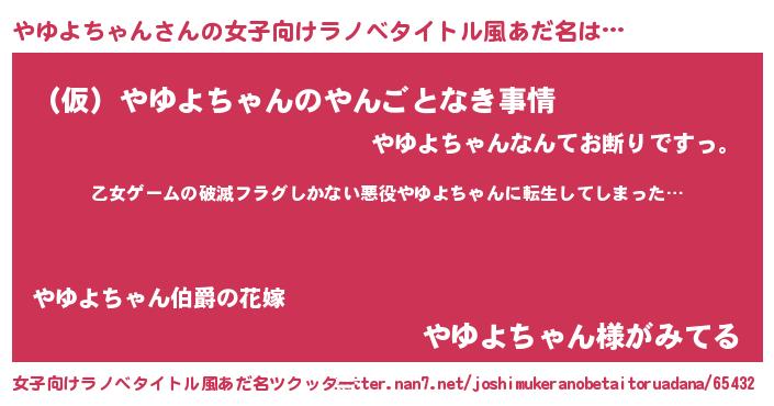 | 男性向けラノベタイトル風あだ名 | 『魔弾の王とやゆよちゃん』 |