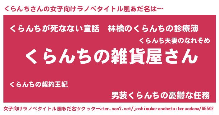 くらんちさんの女子向けラノベタイトル風あだ名は… 『くらんちの雑貨屋さん』『くらんちが死なない童話 林檎のくらんちの診療簿』『男装くらんちの憂鬱な任務』 ツクッター #女子向けラノベタイトル風あだ名ツクッター http://tkutter.nan7.net/joshimukeranobetaitoruadana/65502/