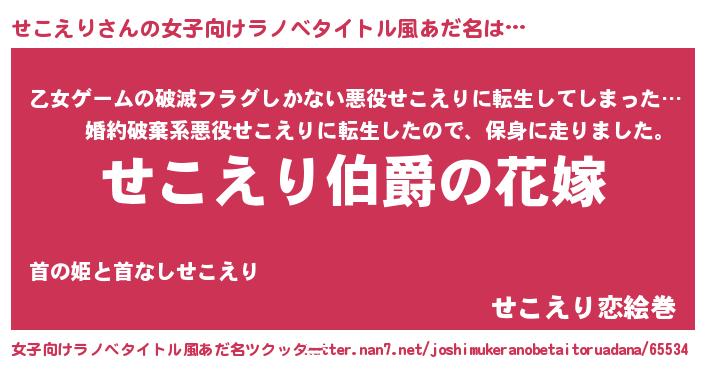 | 男性向けラノベタイトル風あだ名 | 『うちの娘の為ならば、俺はもしかしたらせこえりも倒せるかもしれない。』 |