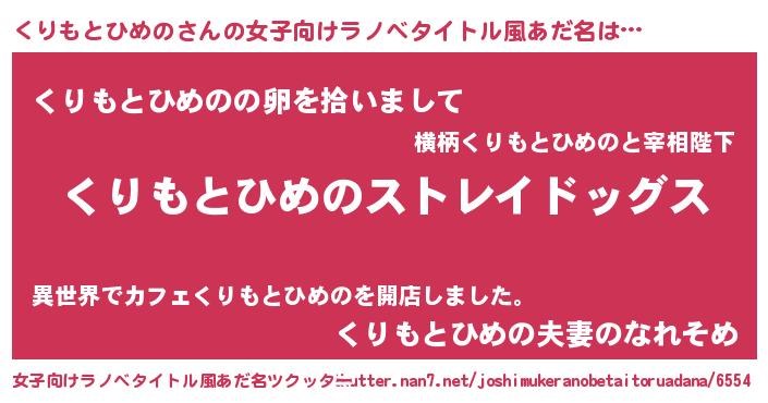 くりもとひめのさんの女子向けラノベタイトル風あだ名は… 『くりもとひめのストレイドッグス』『くりもとひめのの卵を拾いまして』『くりもとひめの夫妻のなれそめ』 ツクッター #女子向けラノベタイトル風あだ名ツクッター http://tkutter.nan7.net/joshimukeranobetaitoruadana/6554/
