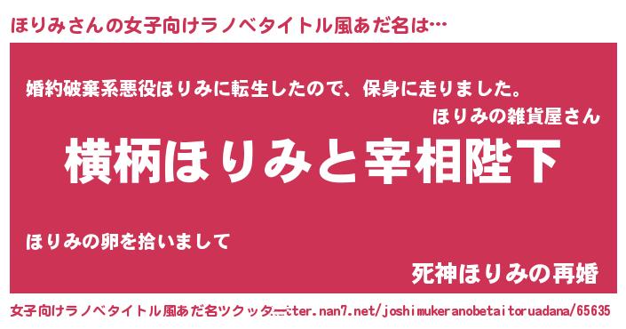| 男性向けラノベタイトル風あだ名 | 『ほりみに滅ぼされるだけの簡単なお仕事です』 |