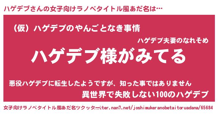 | 男性向けラノベタイトル風あだ名 | 『ハゲデブの嫁は女の子じゃないと思った?』 |