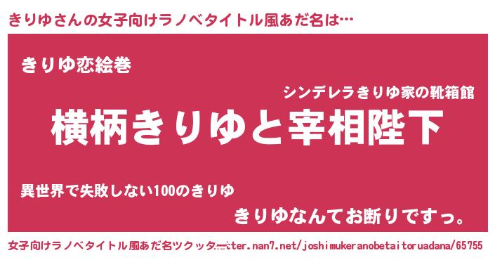 きりゆさんの女子向けラノベタイトル風あだ名は… 『横柄きりゆと宰相陛下』『きりゆ恋絵巻』『きりゆなんてお断りですっ。』 ツクッター #女子向けラノベタイトル風あだ名ツクッター http://tkutter.nan7.net/joshimukeranobetaitoruadana/65755/