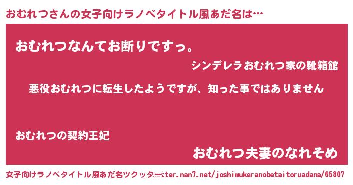 | 男性向けラノベタイトル風あだ名 | 『この素晴らしい世界におむれつを!』 |