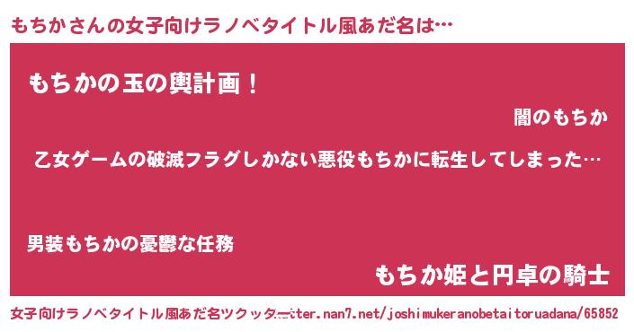 | 男性向けラノベタイトル風あだ名 | 『この素晴らしい世界にもちかを!』 |
