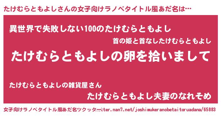 | 男性向けラノベタイトル風あだ名 | 『たけむらともよしの嫁は女の子じゃないと思った?』 |