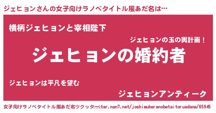 ジェヒョンさんの女子向けラノベタイトル風あだ名は… 『ジェヒョンの婚約者』『横柄ジェヒョンと宰相陛下』『ジェヒョンアンティーク』 ツクッター #女子向けラノベタイトル風あだ名ツクッター http://tkutter.nan7.net/joshimukeranobetaitoruadana/65945/