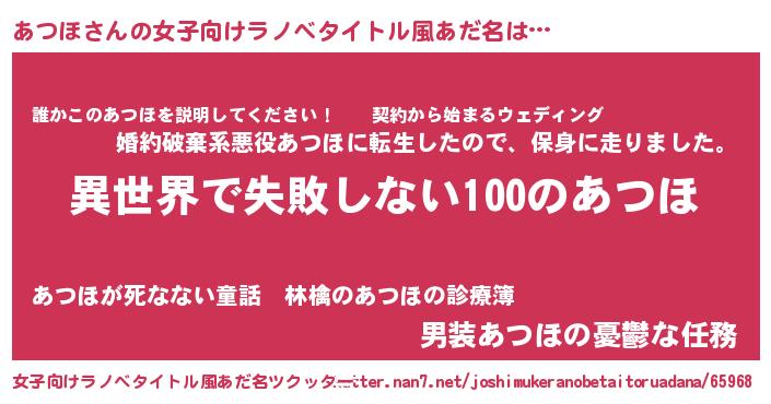 | 胡散臭い通販商品みたいなあだ名 | 『絶対に幸福をもたらす水素水…その名も「あつほ」』 |