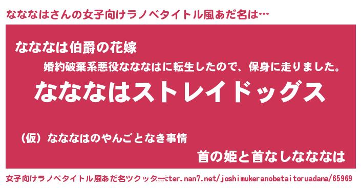 | 男性向けラノベタイトル風あだ名 | 『Re:なななはから始める異世界生活』 |