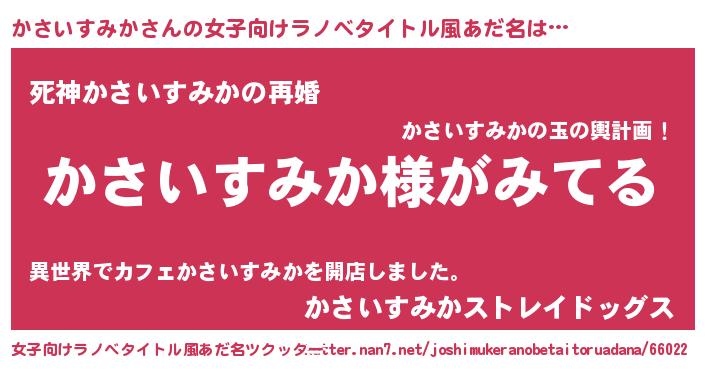 | 男性向けラノベタイトル風あだ名 | 『かさいすみかの嫁は女の子じゃないと思った?』 |