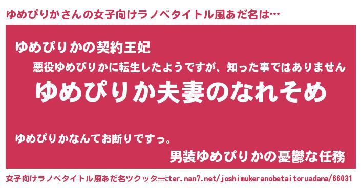 | 男性向けラノベタイトル風あだ名 | 『おまえをオタクにしてやるから、俺をゆめぴりかにしてくれ! 』 |