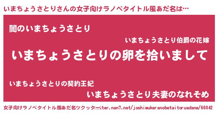 | 男性向けラノベタイトル風あだ名 | 『いまちょうさとりの嫁は女の子じゃないと思った?』 |