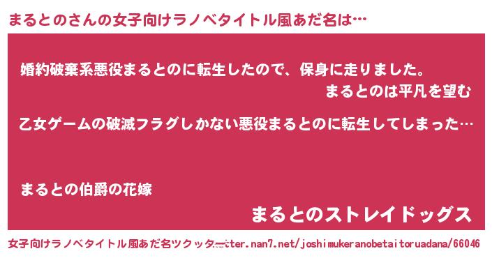 | 男性向けラノベタイトル風あだ名 | 『この素晴らしい世界にまるとのを!』 |