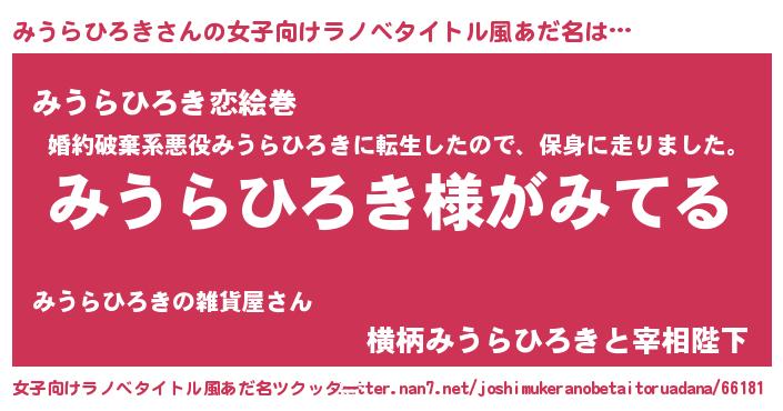 | 男性向けラノベタイトル風あだ名 | 『みうらひろきの嫁は女の子じゃないと思った?』 |