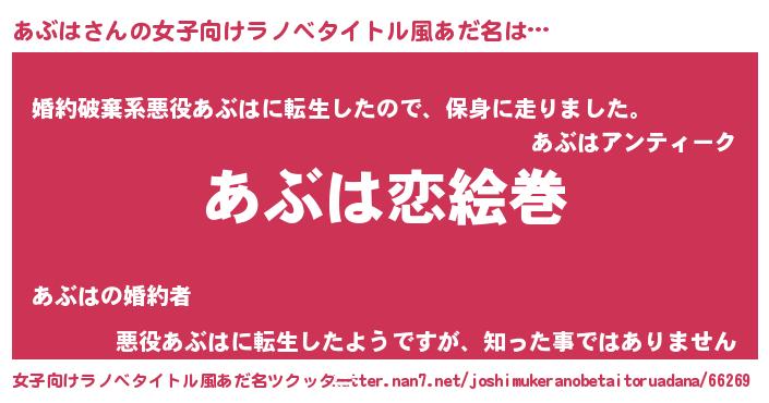 | 男性向けラノベタイトル風あだ名 | 『おまえをオタクにしてやるから、俺をあぶはにしてくれ! 』 |