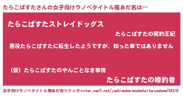 | 男性向けラノベタイトル風あだ名 | 『この素晴らしい世界にたらこぱすたを!』 |