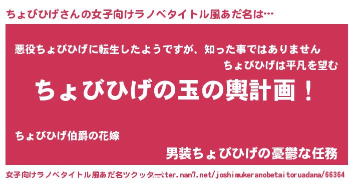 ちょびひげさんの女子向けラノベタイトル風あだ名は… 『ちょびひげの玉の輿計画!』『悪役ちょびひげに転生したようですが、知った事ではありません』『男装ちょびひげの憂鬱な任務』 ツクッター #女子向けラノベタイトル風あだ名ツクッター http://tkutter.nan7.net/joshimukeranobetaitoruadana/66364/