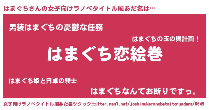 | 男性向けラノベタイトル風あだ名 | 『おまえをオタクにしてやるから、俺をはまぐちにしてくれ! 』 |