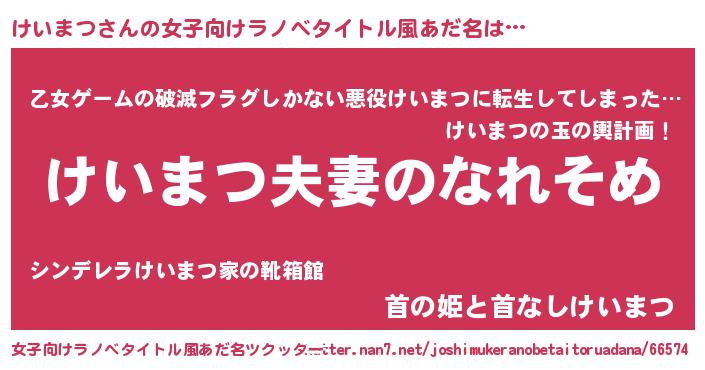 | 男性向けラノベタイトル風あだ名 | 『おまえをオタクにしてやるから、俺をけいまつにしてくれ! 』 |