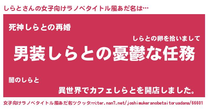 | 男性向けラノベタイトル風あだ名 | 『うちのしらとが世界を掌握している!』 |