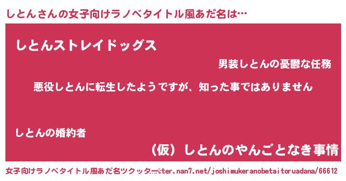 | 男性向けラノベタイトル風あだ名 | 『この素晴らしい世界にしとんを!』 |