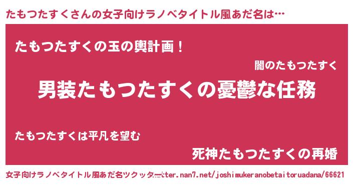 | 男性向けラノベタイトル風あだ名 | 『冴えないたもつたすくの育てかた』 |