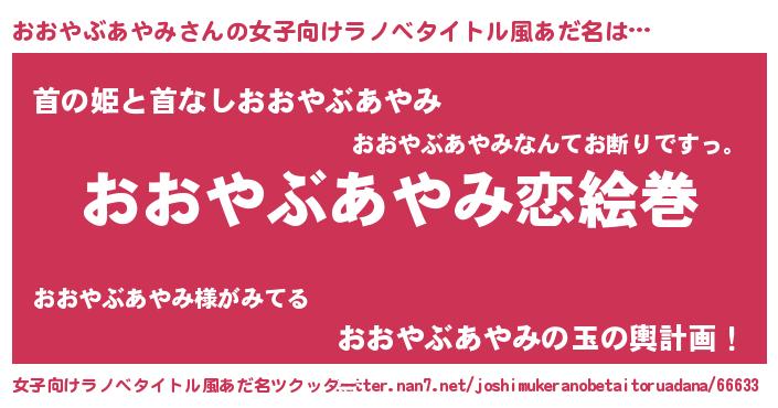 | 男性向けラノベタイトル風あだ名 | 『おまえをオタクにしてやるから、俺をおおやぶあやみにしてくれ! 』 |