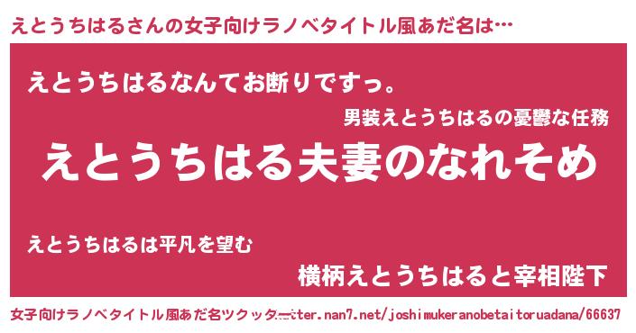 | 男性向けラノベタイトル風あだ名 | 『おまえをオタクにしてやるから、俺をえとうちはるにしてくれ! 』 |