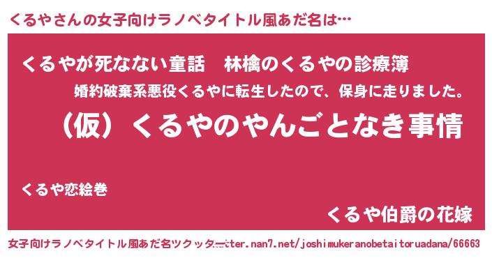 | 男性向けラノベタイトル風あだ名 | 『くるやの憂鬱』『魔弾の王とくるや』 |