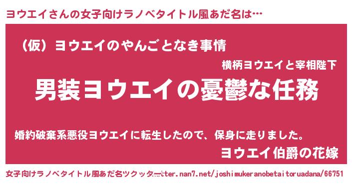 | 男性向けラノベタイトル風あだ名 | 『うちのヨウエイが世界を掌握している!』 |