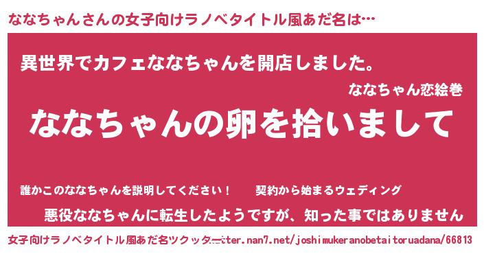 | 男性向けラノベタイトル風あだ名 | 『ダンジョンにななちゃんを求めるのは間違っているだろうか』 |