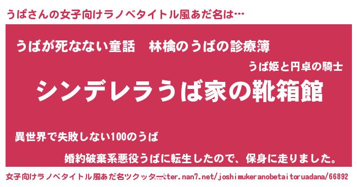 うばさんの女子向けラノベタイトル風あだ名は… 『シンデレラうば家の靴箱館』『うばが死なない童話 林檎のうばの診療簿』『婚約破棄系悪役うばに転生したので、保身に走りました。』 ツクッター #女子向けラノベタイトル風あだ名ツクッター http://tkutter.nan7.net/joshimukeranobetaitoruadana/66892/