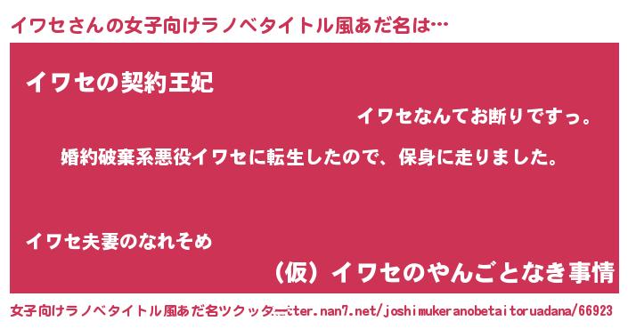| 男性向けラノベタイトル風あだ名 | 『イワセスレイヤー』『イワセの憂鬱』 |